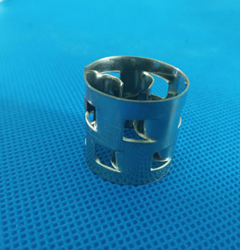 鮑爾環(huán)填料是一種新型填料,是針對拉西環(huán)的一些主要缺點加以改進而出現(xiàn)的,雖然環(huán)外徑也是等于高度,但環(huán)壁上開出兩排帶有內(nèi)伸舌片的窗,每層窗孔有5個舌片。這種結(jié)構(gòu)改善了氣液分布,并且讓環(huán)的內(nèi)表面得到了充分利用。與拉西環(huán)相比,處理量可大50%以上,而壓降低一半。