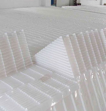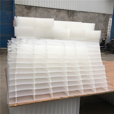 斜板填料主要由共聚聚丙烯材料制成。斜板填料按構(gòu)造型式可分為:小間距斜板 、接觸絮凝斜板和復(fù)合斜板,而我公司主要以生產(chǎn)小間距斜板填料為主。它由斜板片和肋條兩部分組成,外觀為平行六面體,側(cè)面為傾角60°的平行四邊形,斜板間距為25mm,板材與工字條之間間采用電洛鐵熱合焊接固定。